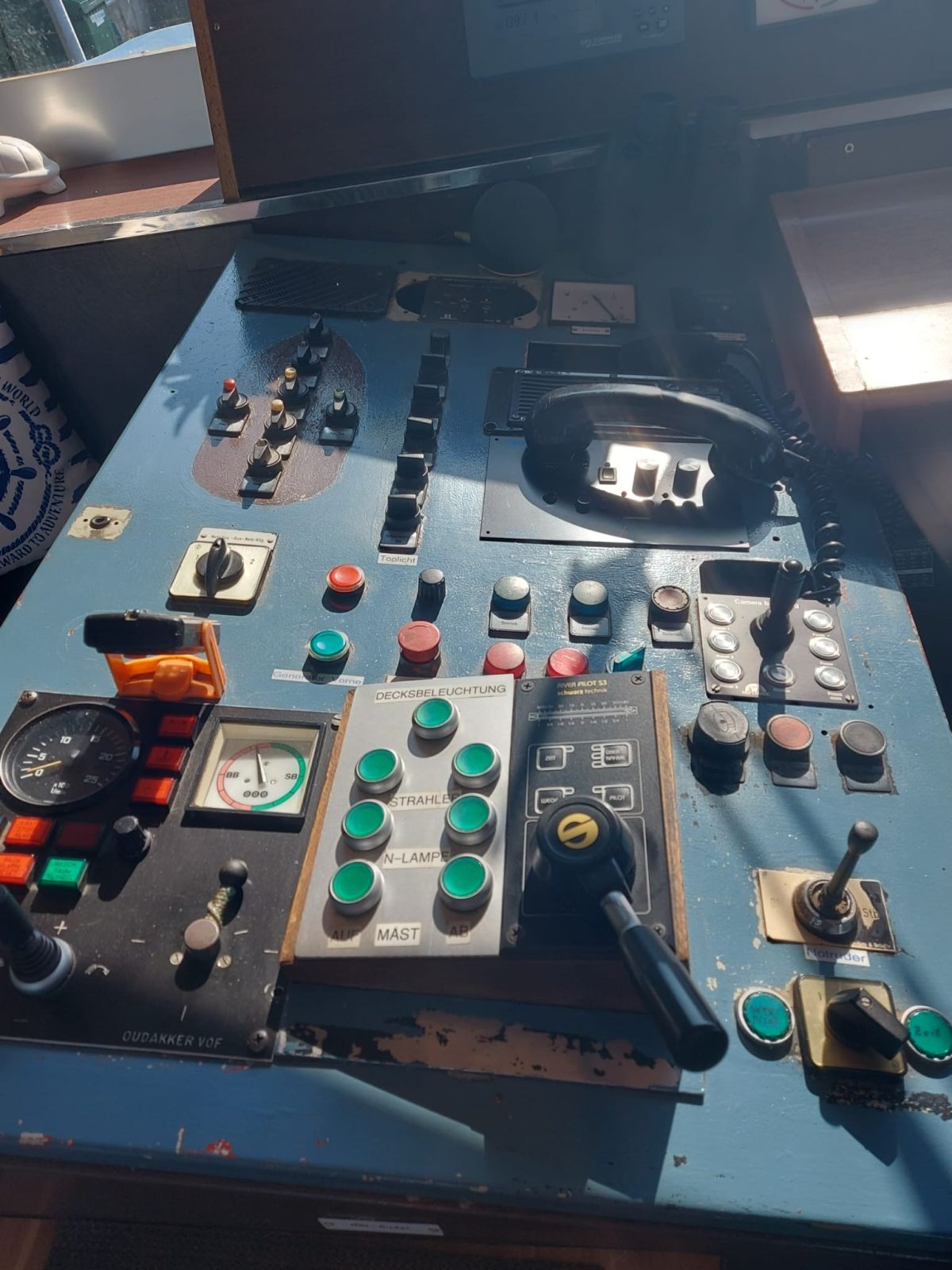 Bugstrahlruder 255 PS, Hilfsmaschinen 38 kVA Deutz vorn; 32 kVA Hatz silent pack 2010 grundüberholt eingebaut; 18 kVa Deutz Oudaker Scania 2008 grundüberholt eingebaut, Ruderhauslift, Stülpstand, 2-Flächen Ruder hydraulisch 2006 neu; Ankerwinden vorn/hinten elektrisch, MTH Radar (neu 2017) auf Edelstahl Mast (Mast Bj. 2015), Autopilot (Schwarz, neu 2014), Echolot (neu 2017), AIS, Tresco, Kompass, Autokran (2018 überholt), , Umbauten/Erneuerungen:, 1981 Schiff zum 1-Raum-Schiff umgebaut,, 1996 Vorderkajüte neu ausgebaut, Bugstrahlruder neu, Achterwohnung z.T. ausgebaut, 1998 7 mm Eisen auf die Bongossistrau gelegt, neuer Ruderanlage, 2007 Kimm gedoppelt, 2009 neue Akku, Welle neu gebuchst, Propeller überholt, 2010 AIS, Generator neu, 2011 im Juli Überholung Hauptmaschine, 2014 Wohnung hinten umgebaut / neu eingeteilt, 2015 Lukendach abgebaut, 2017 neuer Generator 18kVA Kipor, Dom Kameras, Steuerhaus neu ausgebaut, Materialstärken:, Boden 6,2-7,2 mm, Kimm voll gedoppelt ca. 2007; Bordwände 6,2-8,4 mm; Höhe der Bodenstege 36 cm